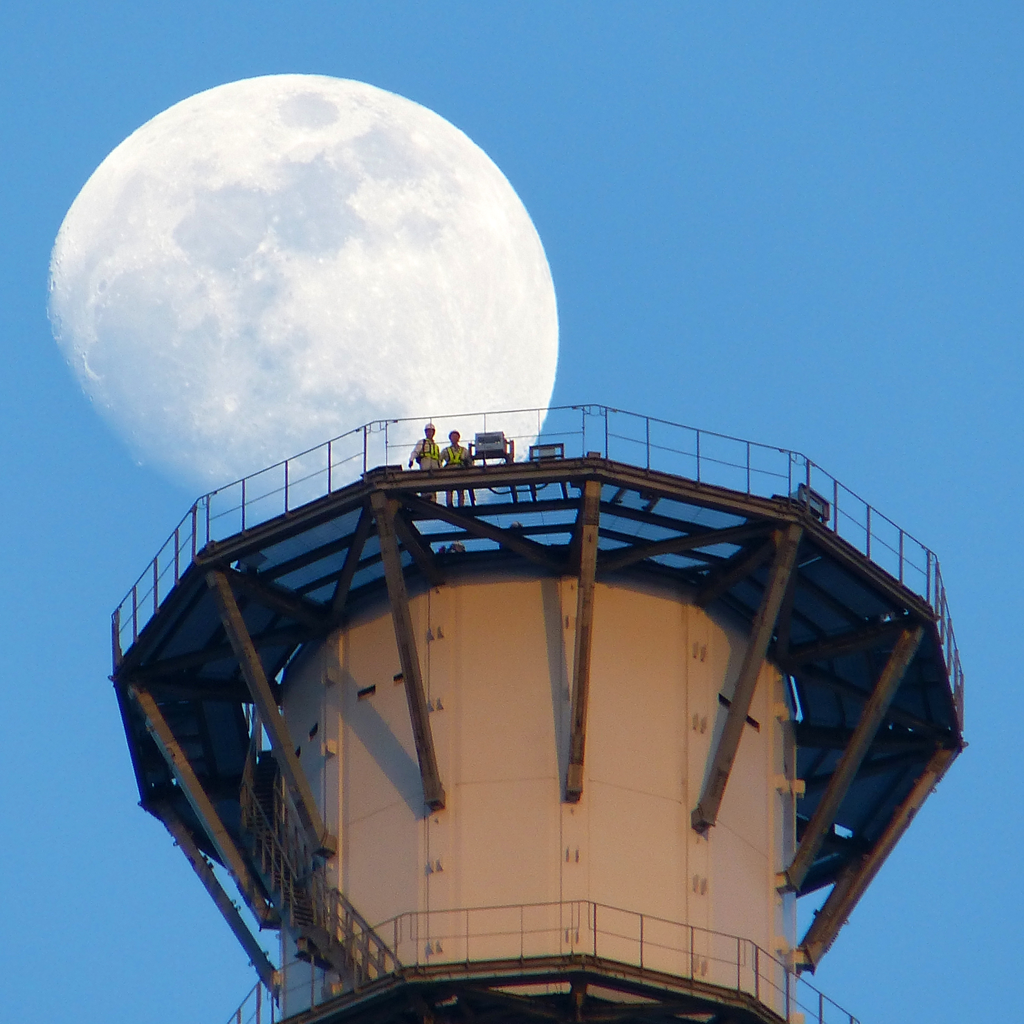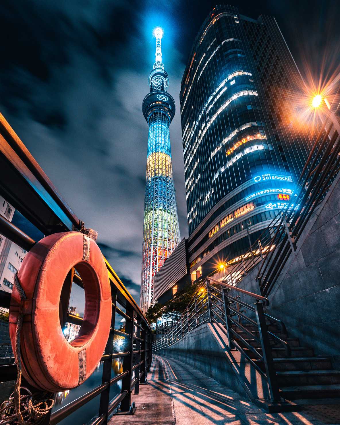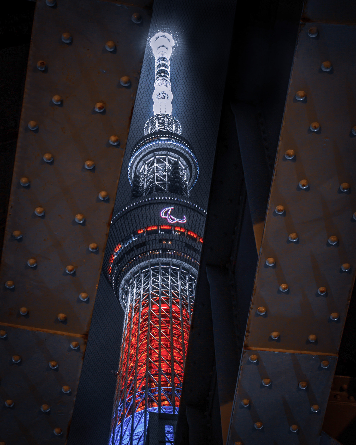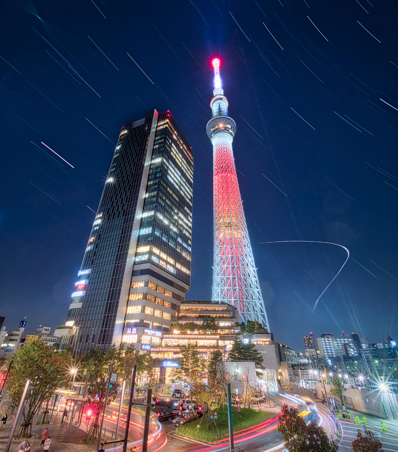 ある日の夕方、東の空に月が昇ってきたのに気づき、スカイツリーのてっぺんに月を重ねて撮っていたら、数人のスタッフが現れ照明テストを始めました。スタッフがこちらに向かってポーズを取っているような・・・ 人と月の圧縮写真が撮れると思っていなかったのでとても興奮しました。この度は作品を評価して頂きありがとうございました。