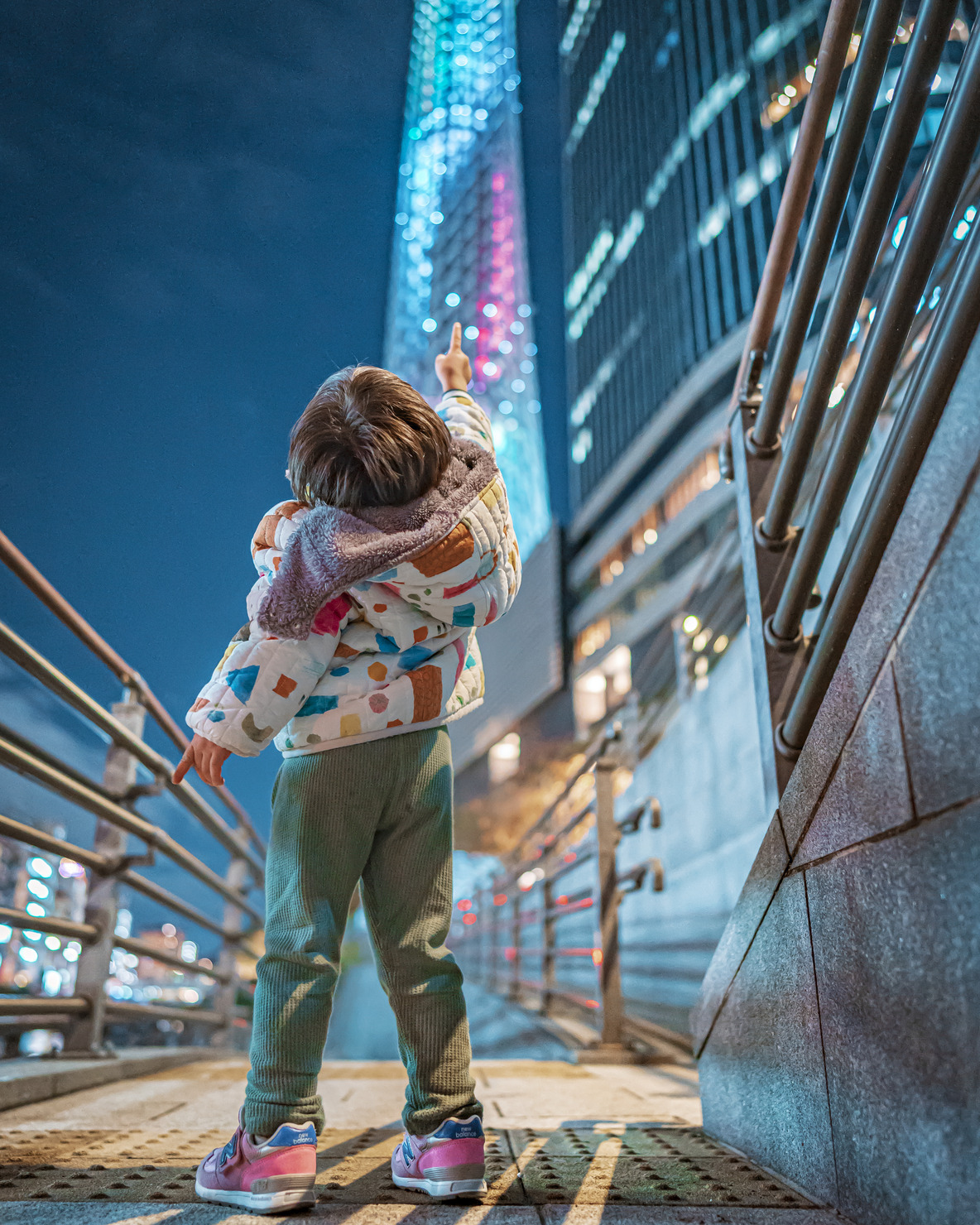 スカイツリーの定番スポットにて撮影をしていたところに当時3歳の息子が入り込んできた瞬間を撮りました。我ながらいい写真が撮れたと思ってはいたものの、まさか賞を頂けるとは思っていなかったので本当にうれしく思います。ありがとうございます。これも息子のおかげなので大きめのおもちゃでも買ってあげたいです。子供はポーズをとってはくれず、運も大きいですが、引き続きスカイツリーと子供を撮り続けて行こうと思います。